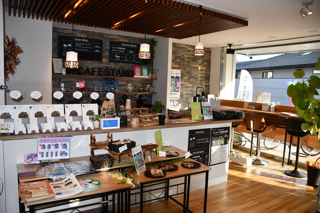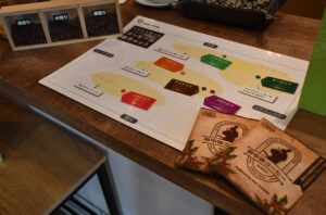 カウンター席は4席。6種類のスペシャリティコーヒーを用意し、卓上焙煎機で生豆から好みの深さ(3種類)で焙煎する。焙煎後の豆の購入のほか、その場で淹れて飲むこともできる(1杯税込350円、焙煎50g同500円)。オリジナルのドリップパック「府中侍コーヒー」(同200円)も販売する=写真。