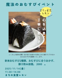 11月14日〔金〕午前11時30分—午後2時、「魔法のおむすびイベント」を開催する。同市神辺町産のヒノヒカリを炊いた新米おむすび2種類(塩むすび、シャケ、昆布、うめ、ツナマヨから選ぶ)と、おむすびに合うおかず(地元農家自家製の白和えなど)、豚汁飲み放題で同2千円。参加希望者は下記QRコードから申し込む。当日は美味しい胡麻の物販もある。