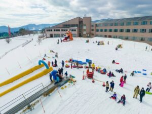 ◇目の前に雪化粧の蒜山三座を望むホテルで、目の前の広大なスペースに、約50mのコースを滑走するスノーチューブや、タイガースライダー等のアトラクションが楽しめる西日本最大級の「ひるぜんキッズスノーパーク」を12月27日〔土〕から土日祝日限定でオープンする。宿泊客は無料で利用できる他、日帰客には地元グルメが満載のランチビュッフェが楽しめる。スノーパークの営業時間は午前9時―午後4時(最終入場3時)。入場料金は4歳―大人1日800円(税込)。