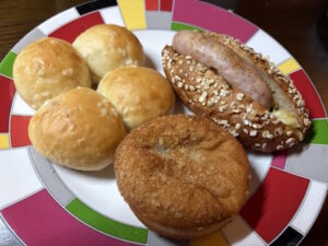 小麦粉やオリーブオイルに塩などを加えたイタリア発祥の平たいパン「フォカッチャ」の生地に沖縄県産の塩を使った「四角い塩パン」=左=が人気。生地のなかにバターを入れて焼き上げることでパンの下部はバターで焼いたようなカリカリ感を出した。3cm四角の4つのパンを一つ一つちぎりながら食べられる。価格は260円。自家製のカレーソースが特徴の「牛肉のカレーパン」=中央=やバジルソーセージを挟んだ「Sogiiドッグ」=右=を支持する客も多く、池田亜希店長は「レンジで600wで20秒温めて、トースターで2―3分調理すると焼きたての食感が楽しめる」と話した。