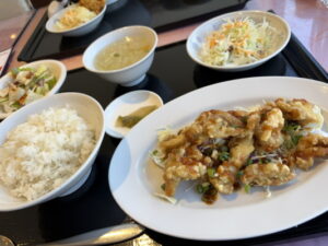甘辛いソースがかかった一口サイズの細長い鶏の唐揚げがメーンの「唐揚げ定食」(1155円)=写真=が人気。長さ6cm、厚さ1cmの柔らかい唐揚げ(10個)と下部の刻んだシャキシャキのキャベツとの食感が楽しめ、ご飯と合わせると、甘辛いソースと肉汁の相性が良い。豚しゃぶの乗ったサラダと通常の2種類のサラダに加え、ザーサイで口直しをしながら楽しむ客も多いと言う。女性客が多く、野菜たっぷりの「八宝菜定食」や「五目そば」が人気だが、鳥越弘晃店長は「ご飯と鶏のから揚げの相性は抜群。チカラ飯として楽しんで」と話した。