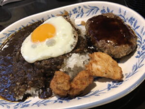 タマネギとニンジン、ショウガにスパイスを加えて2日間煮込んだ辛口のカレーが定番商品。チキンフライやエビフライ、ポテトがトッピングされた「レディースカレ」(1450円)が人気でカレーソースをチキンフライに付けてタンドリーチキン風にしてご飯と合わせる客が多いと言う。メニューにはジェラートが付き、追加で珈琲を注文すれば、カレーで温まった口の中をジェラートで冷やし、珈琲でさらに頭がシャキッとすると言う。カレーはメニュー表では「カレ」と表記しており、2代目の梅田雄三さん(42)によるとオーダーを通す際に簡素化されたと言う。写真は日替わりメニューの「イチオシカレ」(1300円)。