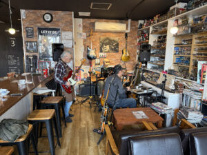 店内に入ると、飛行機、車、戦艦、アニメキャラクターなどびっくりするほどの数のフィギアがズラリ並ぶ。さらに、ロック、ジャズ、ポピュラー、演歌、Jポップ、映画音楽といった「ジャンルに拘らない美学」を貫いているマスターがコレクションした、レコード・CDがズラリ千枚。レコード・CDを聴きながら、コーヒーやアルコール、軽食が楽しめる。時々、地元のミュージシャンが楽器を持って来店し、ゲリラセッションが始まるのが実に楽しい。一見無秩序に思えるが、そこにあるルールは「拘らないことと、自由。そして人に響くかどうか」。営業・午後2時─夜12時、定休・水曜。ギター・ボーカルレッスン開催中。