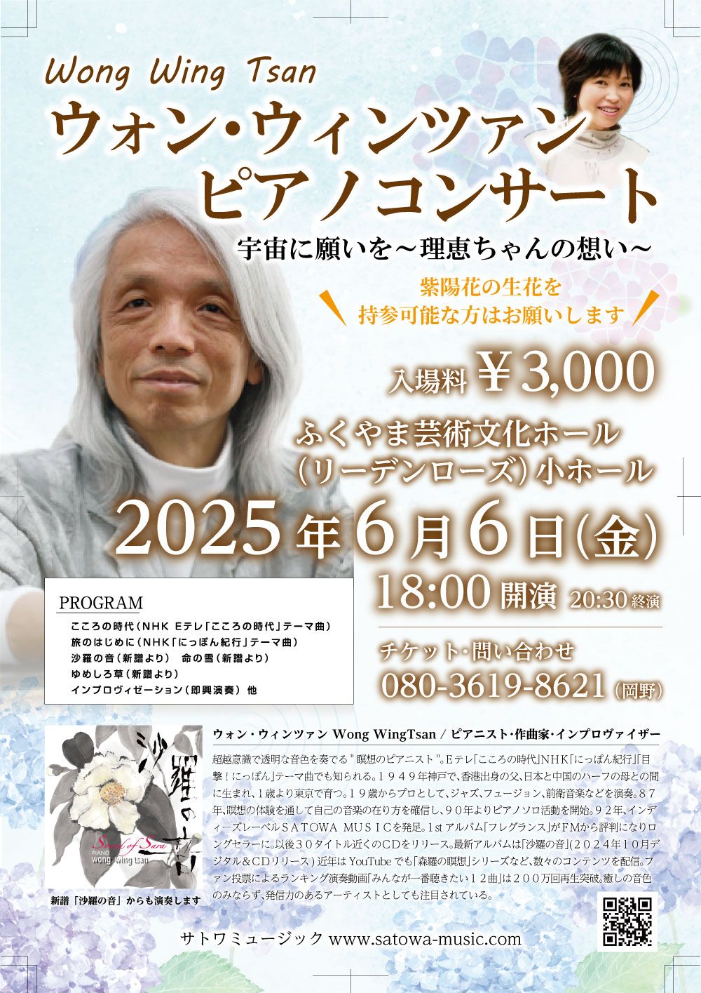 福山市松浜町のふくやま芸術文化ホール(リーデンローズ)小ホールで6月6日〔金〕午後6時から、「ウォン・ウィンツァンピアノコンサート 宇宙(そら)に願いを〜理恵ちゃんの想い〜」を催す=写真。入場料は3千円で、問い合わせなどは岡野則子さん(電080・3619・8621)まで。