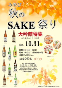 広島県労働会館「みやび」(福山市南蔵王町4―5―18、電084・925・3800)は10月31日〔金〕午後6時30分から8時30まで、2階鳳凰の間で「秋のSAKE祭り・大吟醸特集」(入場料7千円)を開催する。限定200人、要予約。