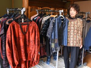 手打ち蕎麦「石楠花(しゃくなげ)の郷」(福山市芦田町上有地2997—4、木村圭子店長、電084・983・2829)で11月13日〔木〕—16日〔日〕と12月18日〔木〕—21日〔日〕、着物リフォームちば(同市御幸町下岩成、千葉久美子代表)の「展示&相談会」を行う=写真は千葉代表と作品。浴衣や着物をほどいて作ったリメイク服や帽子、ハンドバッグやコースターなどの小物類を展示販売する。