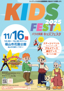 グルメイベント・福山フードフェスタが、「バラの笑顔 キッズフェスタ」に名称を変えて、11月16日〔日〕午前10時30分―午後4時30分に、福山市花園公園(福山市花園町2―7―1)に開催する=写真。