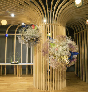 創流80周年を越える、いけばなの閑渕(かんえん)流(本部=福山市入船町2―1―20、家元・小川閑渕さん、電084・921・6879)は、11月15日〔土〕―17日〔月〕に福山天満屋(同市元町)7階大催場で「いけばな閑渕流展―平和を祈って―」を開催する=写真は今年4月に三原で開催されたいけばな展の様子。
