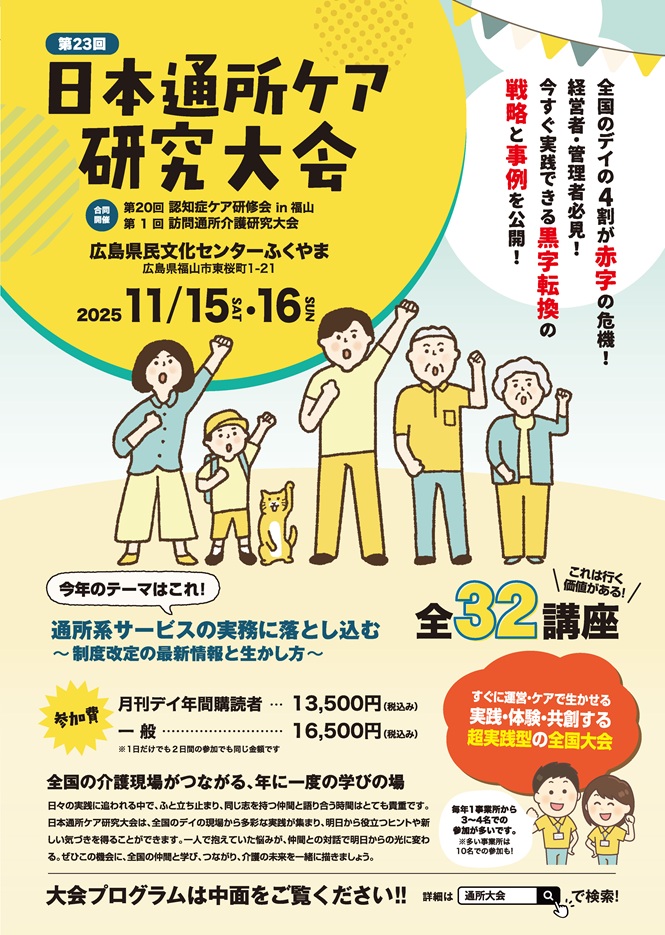 介護・出版・教育事業の㈱QOLサービス(福山市春日町浦上1205、妹尾弘幸社長、電084・948・0439)は11月15日〔土〕・16日〔日〕、同市東桜町の広島県民文化センターふくやまで、第23回日本通所ケア研究大会=ポスター=と第20回認知症ケア研修会in福山、第1回訪問通所介護研究大会を合同開催する。「通所系サービスの実務に落とし込む~制度改定の最新情報と活かし方~」をテーマに全32講座を用意。参加費は税込1万6500円だが、同社が発行する「月刊デイ」の年間購読者は3千円を割り引く。