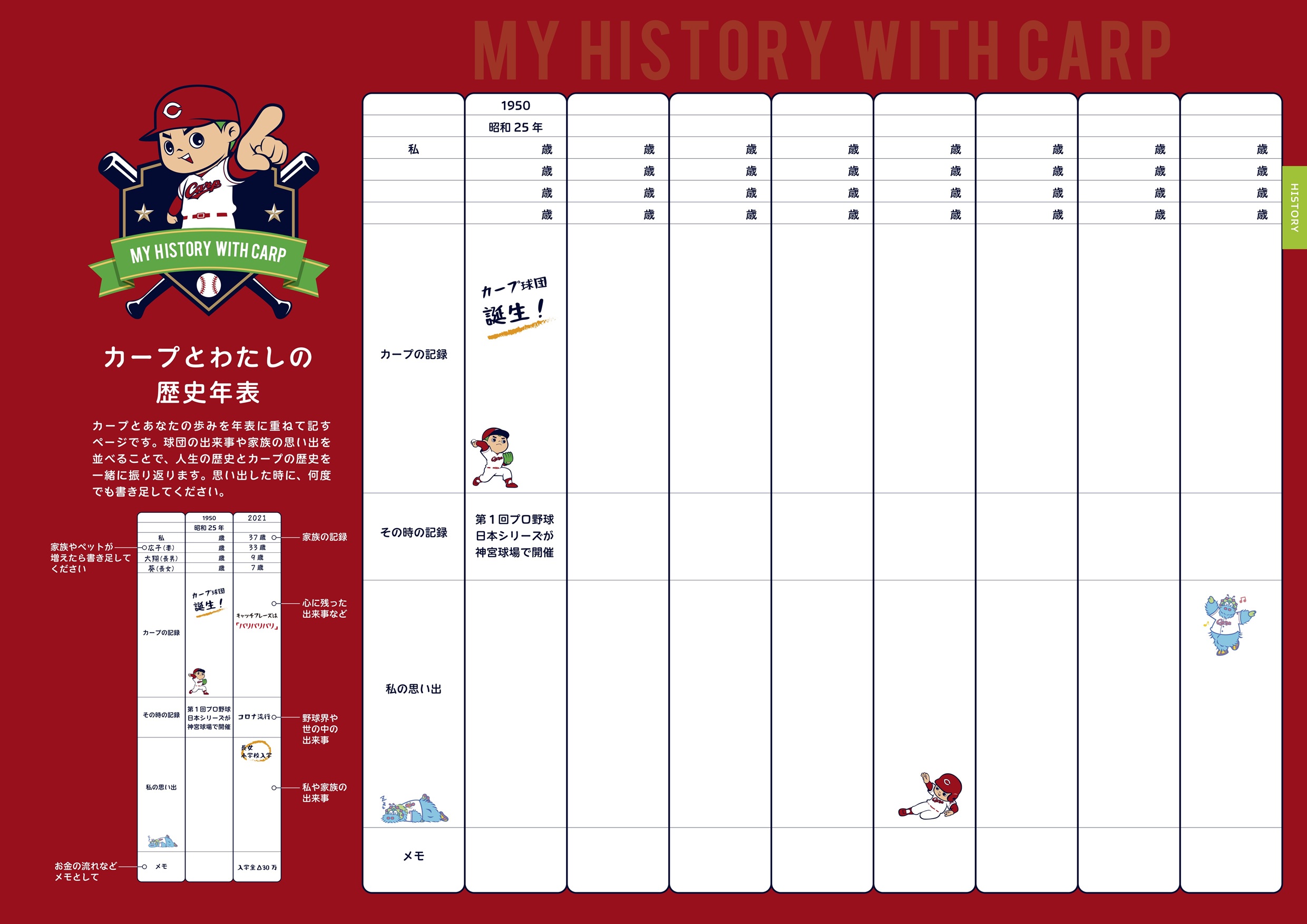 さらに、〝書いて終わり〟にしないで何度でも開くきっかけになるように、1年間のカープ全試合の結果をつけるページを設けたほか、各ページにもカープ坊ややスライリーなどのカープキャラクターが満載=写真中。赤川理事長は「終活を縁起が悪いなどと考えず、カープと一緒に楽しく、前向きに生きるグッズとしてご活用くだされば」と話している。