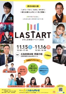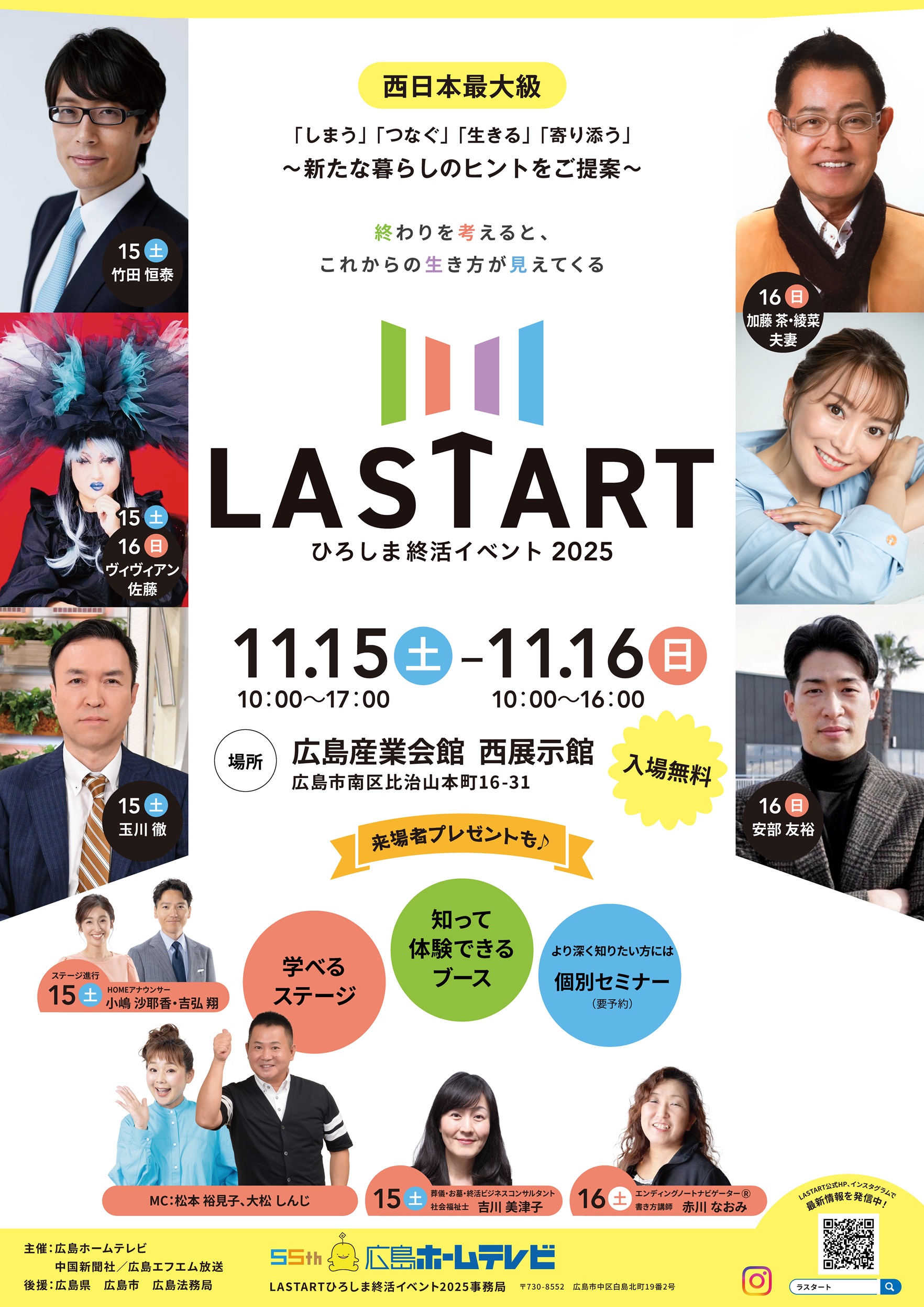 なお、11月15日と16日〔日〕に、広島市南区の広島産業会館西展示場で西日本最大級の終活イベント「LASTART(ラスタート)ひろしま終活イベント2025」(広島ホームテレビなど主催)が行われ=写真下、「カープとわたし 終活はじめの一歩」の展示即売も行う。入場無料。16日の午前10時20分から30分間、赤川理事長が「終活のはじめ方」としてオープニングトークを行うほか、午後0時30分から元カープ選手の安部友裕さんがカープ棺(㈱共栄製、福山市新市町)に入棺体験を行うほか、同日午後2時から3時、加藤茶・綾菜夫妻によるトークイベントもある。