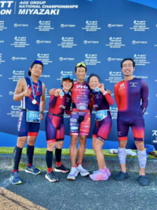 福山市内在住のプロマインドアスリートの福元テツローさん(メール=fukumoto0623@gmail.com)主導で市内在住の50、60歳代の男女4人が宮崎市で開催されたトライアスロンの日本選手権「2025ナショナルチャンピオンシップ」に出場した。いずれも上位に入賞しており、福元さんは「ゆくゆくは世界大会を」とエールを送り、継続的に指導している。