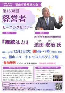 福山市倫理法人会(福山市城見町2―1明正ビル2階、梅西大輔会長、電084・973・6533)は12月2日〔火〕午前6時から、福山ニューキャッスルホテル2階で経営者モーニングセミナーを行う。聴講及び駐車場代(3時間)は無料。