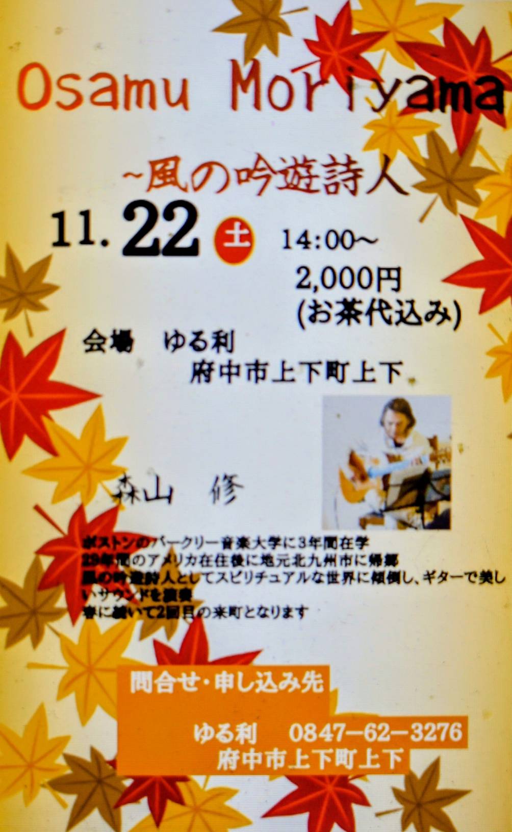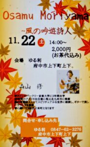 歴史情緒ある白壁の町並み商店街内の、カフェと雑貨の店「ゆる利」(府中市上下町上下837-1、黒木保江店主、電0847・62・3276)で11月22日〔土〕午後2時から、~風の吟遊詩人~森山修さんのギターライブが行われる=チラシ。参加費は2千円(お茶代込み)で、前日までに要予約。