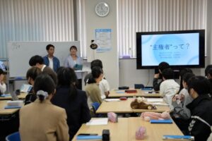 通信制のおおぞら高校福山キャンパス(福山市三之丸町9―16・山陽第2ビル1階、白井幸大キャンパス長、電084・931・0700)は国や社会の問題課題を自分ごとととらえ、公平な判断ができる人物を目指す「主権者教育」の授業を10月に1・2年生に実施した=写真。