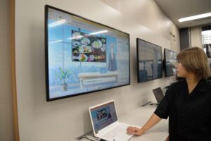 通信大手のソフトバンク㈱(東京都港区、宮川潤一代表取締役社長執行役員兼CEO)が運営する、地域課題解決に向けたイノベーションの創出を目的とした技術開発拠点「せとうちTech LAB」(福山市紅葉町2―27・日本生命福山ビル1階)は、体験型の先端技術を紹介する「テクノロジーエリア」を、AIコンテンツを拡充した内容にリニューアルした=写真上下。