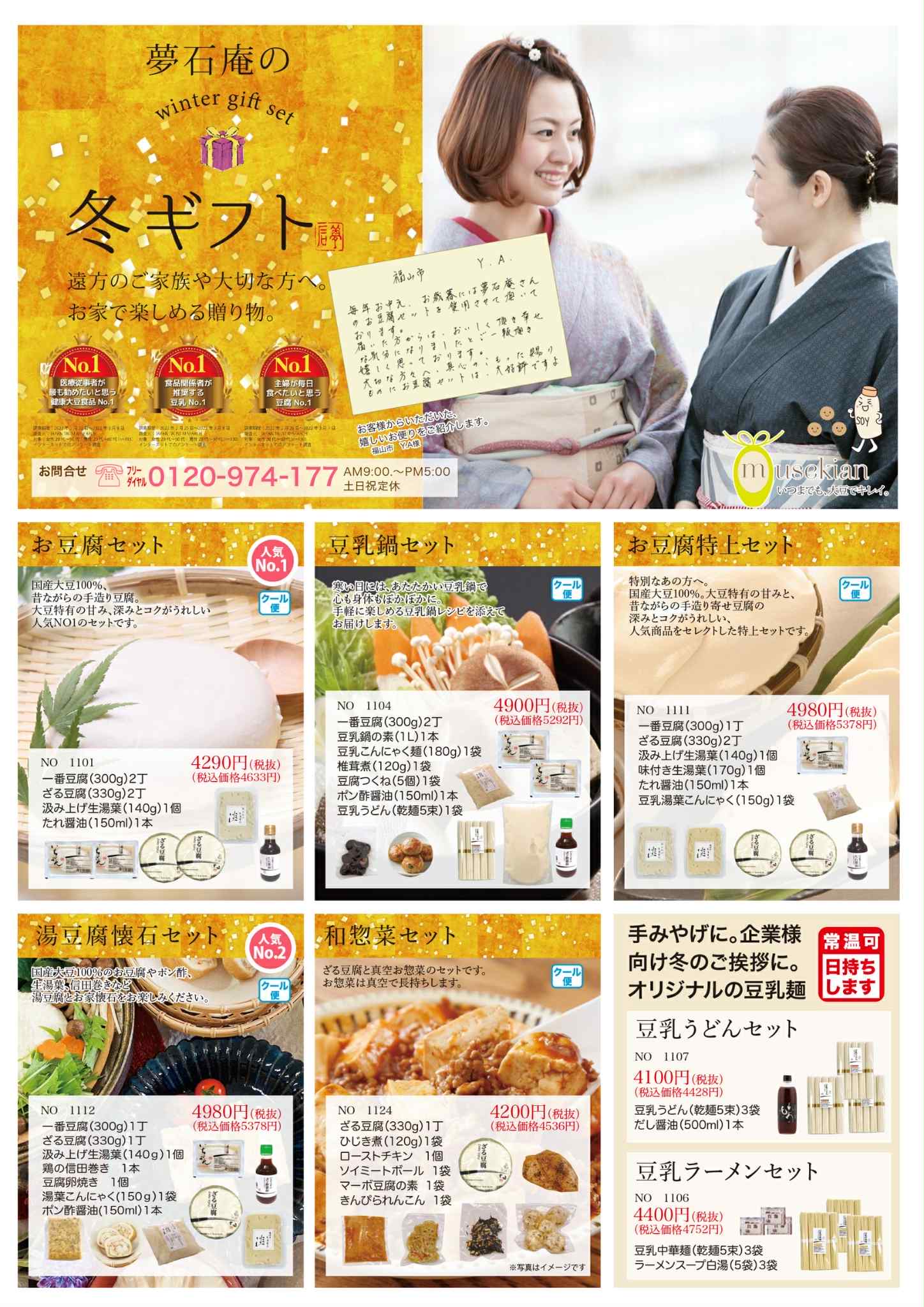 主に地元備後の契約農家が大切に育てた低農薬大豆を使った加工食品を製造販売する㈱夢石庵(福山市曙町6―14―15、森真保社長、フリー0120・974・177、https://www.musekian.jp/)はこのほど、年末年始に向けて健康志向のお歳暮セット=写真上=やお節料理=写真下=などの受付を始めた。