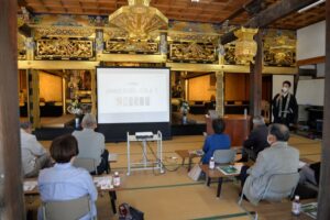 仏教寺院・鈴明山・浄泉坊(福山市赤坂町1567、佐々木翔陽住職、電084・951・1142)は、通信大手のソフトバンク㈱(東京都港区、宮川潤一代表取締役社長執行役員兼CEO)の支援を受けて、10月にLINEの活用をテーマにしたスマホ教室を開講した=写真は挨拶をする佐々木住職。