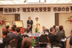 春の叙勲で瑞宝単光章を受章した民生・児童委員「佐藤勢子さん」(福山市駅家町万能倉)の受章感謝の会が10月12日、福山ニューキャッスルホテル(同市三之丸町8─16)で開かれ、地元政財界人・関係者らが受章を祝った。