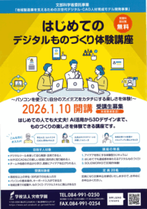 〔学法〕穴吹学園・穴吹カレッジキャリアアップスクール(福山市三之丸町30―1・さんすて福山3階、電084・991・0250)は、文部科学省委託事業としてAIや3DCADの基本が学べる短期講座「はじめてのデジタルものづくり体験講座」を来年1月10日―31日の土曜日(全4日)午前10時―午後5時に開催する=写真。受講無料。昼休憩あり。