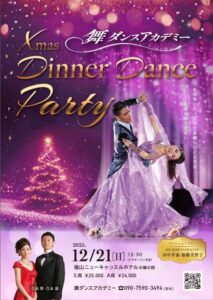 幅広い年齢層にソシアルダンス(社交ダンス)を教える舞ダンスアカデミー(福山市三吉町1―8―16、吉永舞代表、電084・922・4114)は、福山ニューキャッスルホテル(同市三之丸町)3階・光耀の間で、クリスマスダンスパーティーを12月21日〔日〕に開催する=写真。ドアオープンは午後1時30分。