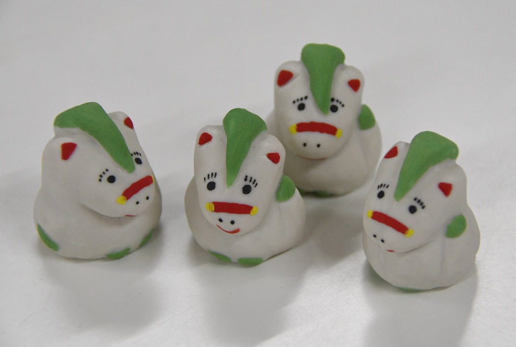 福山地方一円の鬼門守護神で、厄除の神として崇敬を集める艮神社(福山市北吉津町1—5—24、奥康就宮司、電084・922・3149)で12月1日より、来年の干支「午」の陶製縁起物(1千円)=写真上=の授与を始めた。同社社務所でのみ扱う。〔社福〕一れつ会(本部=同市加茂町)の障害福祉サービス事業所しんふぉにい(三吉町)の利用者が1体ずつ手作りしたもので=写真下、運気上昇のお守りとして、また、社会貢献の一環として限定100個を用意した。