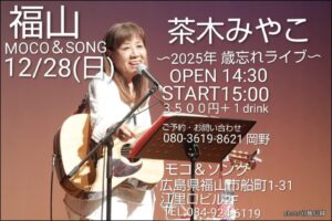 70年代を代表する女性シンガーソングライター・茶木みやこのソロライブコンサート~2025年歳忘れライブ~=写真=が12月28日〔日〕午後3時から、福山ライブハウス「MOCO&SONG(モコ&ソング)」(福山市船町1—31江里口ビル2階)で催される。