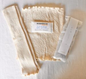 同店では無加工のオーガニックコットンで作った優しい風合いの素材を、柳田代表がビワの葉と丁子(チョウジ)で染めて商品化している。東洋医学では、ビワの葉には血行を良くして冷え性を緩和する効果や、解毒作用や浄血作用があるとされてきた。丁子にも同様に、浄化作用やアンチエイジング、細胞の老化予防や抗酸化などの働きがあるとされる。セットは、同素材を使った、昔ながらのアナログ編み機でメリヤス編みした「きほんの腹巻」(同4700円)か、体にフィットしやすいリブ編みで編まれた「レッグ&アームカバー」(同3700円)のどちらか一方に、草木の優しい香りに包まれて身体が緩まるという「草木湯」(同500円)1袋と、同店の商品素材にも環境にも負荷の少ない界面活性剤フリーの洗剤「arote洗剤」のサンプル(30g)を付ける。