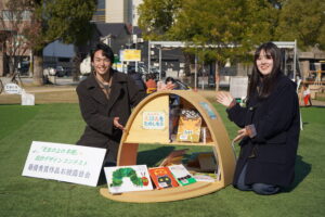 〔公社〕日本建築家協会(JIA)中国支部広島地域会と福山市教育委員会が主催する第4回「芝生の上の本棚設計デザインコンテスト」の「本棚完成お披露目会」が、昨年12月6日に福山市中央図書館(同市霞町)前の中央公園で開催され、最優秀賞に選ばれた「芝生にゴロン♪」(近畿大学 殿村桃果さん、横関竜弥さん)の完成作品=写真=が公開された。