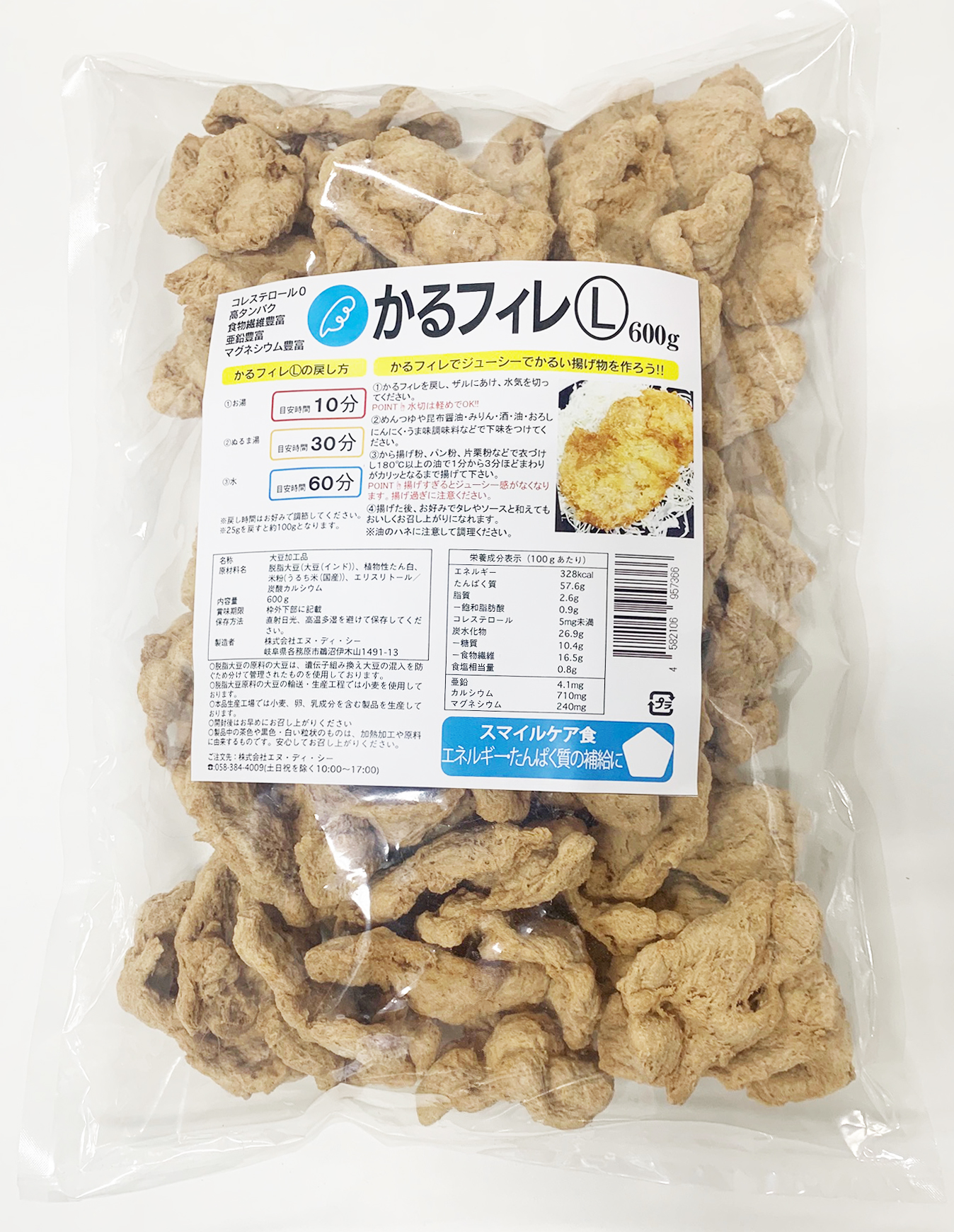 大豆から作られた「大豆ミート」は、低カロリーで高たんぱく。健康志向や海外に多いヴィーガンやベジタリアンの需要に対応する「第3の食材」として話題を集めている。特に、NDC社の大豆ミート「かるフィレ」=写真上=は、大豆と米粉を主原料としているため(製法は特許申請中)、従来品の独特な大豆臭を抑えつつ、フィレ肉のような柔らかくジューシーな食感を実現している。