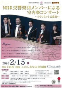 NHK交響楽団メンバーによる室内楽コンサート「クラリネット五重奏」が、2月15日〔日〕午後2時にしまなみ交流館・テアトロシェルネ(尾道市東御所町10―1)で開催される=写真。