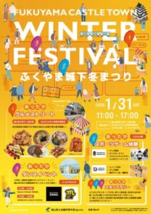 福山商工会議所青年部=福山YEG(事務局=福山市西町・福山商工会議所産業振興部経営課内、小林孝章会長、電084・921・8734)は、「ふくやま城下冬まつり」を1月31日〔土〕午前11時―午後5時に福山駅前を中心に開催する=写真。内容は次の通り。