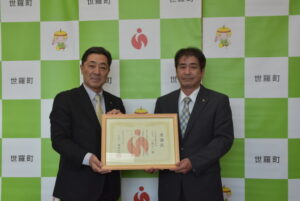 世羅町役場で感謝状を手にする栗原社長、左は奥田町長
