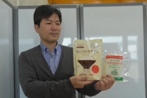 米状の乾燥こんにゃくなどの商材を説明する福田社長