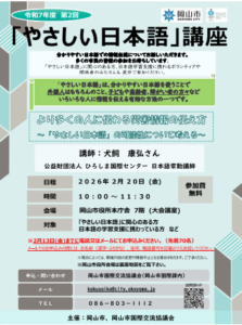 災害時などに外国人にも分かりやすい日本語で情報を伝える方法等を学ぶ「やさしい日本語」講座を2月20日〔金〕午前10時―11時30分に岡山市役所本庁舎(岡山市北区大供)7階大会議室で開催する=写真。参加費無料。