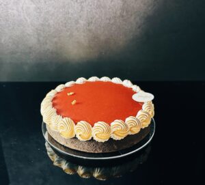 福山市内で7店舗を展開する洋菓子老舗の㈱白ばら(本店=福山市御門町2―3―19、三好浩章社長、電084・922・0811)は、バレンタイン向けに2月14日〔土〕・15日〔日〕限定で「苺と柚子のショコラタルト」(14㎝2800円)を販売する=写真。