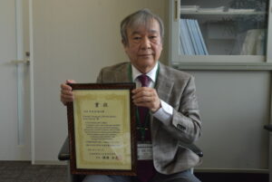 日本生化学会のJB論文賞の表彰状を手にする赤﨑教授