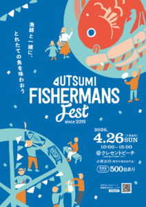 UTSUMI FISHERMANS FEST 実行委員会は4月26日〔日〕午前10時─午後3時、クレセントビーチ(福山市内海町ハ340─7)で、漁師と一緒に獲れたての魚を味わう「UTSUMI FISHERMANS FEST 2026=ポスター」(入場無料)を開催する。福山市、福山市教育委員会、エフエムふくやまが後援、田島漁業協同組合、内海町観光協会、山南運送株式会社、山崎建設株式会社、アイネスふくやまが協力する。