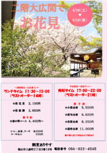 創業1892年(明治25)の割烹「ありやす」(福山市入船町2―3―19、有安孝介店長、電084・922・4545)は3月28日〔土〕─4月10日〔金〕、2階の大広間で桜を見ながらランチ・ディナーを味わう会=チラシ=を開催する。