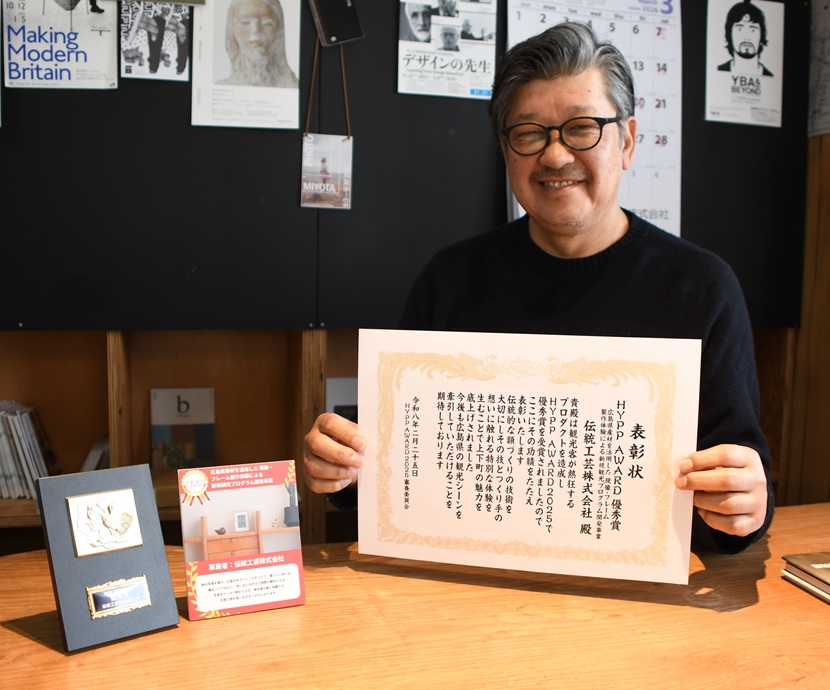 額縁や木製家具などを制作する伝統工芸㈱/DENTO(府中市上下町階見1503、服巻年彦社長、電0847・62・3377)はこのほど、〔一社〕広島県観光連盟(HIT)が主催する、新たな体験型観光コンテンツを顕彰する「HYPP(ハイプ)アワード2025」を受賞した=写真上は服巻社長と。創業以来培ってきた木製フレーム(額縁)製造を改めてオリジナル素材として活用し、ブランディング化を進めていくという。
