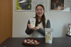 備後地区の特産品開発業の備後地ブランド研究会(福山市、中島美晴代表=岡山大学教育学部2年)は、井原市の酒造メーカーの山成酒造㈱(羽根田晴社長)の主力銘柄「蘭の誉」の酒粕を使った飴を商品化した。日本酒離れが進むなか、関係性が深い中島代表が山成酒造を盛り上げようと企画。井原市芳井町の山成酒造の直売所などで販売する。
