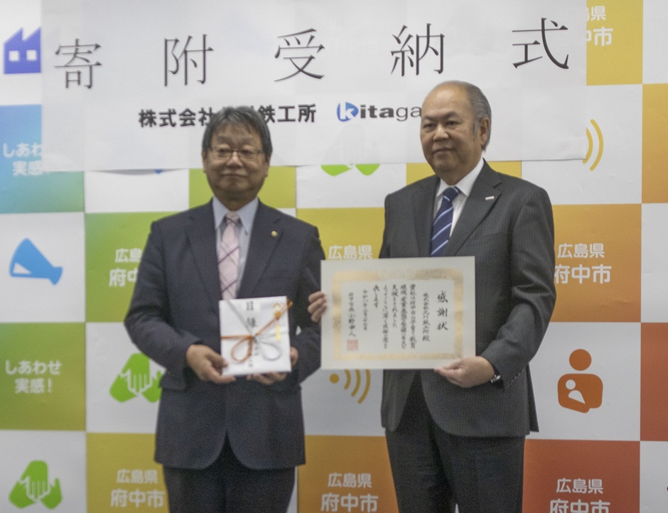 工作機器・産業機械・金属素形材の3事業を展開する㈱北川鉄工所(府中市元町77-1、北川祐治会長、岡野帝男社長、電0847・45・4560)はこのほど、創業以来の拠点である府中市に対し総額2億円を上限とする寄付を実施。その寄附受納式が3月27日、府中市役所で行われ、北川会頭=写真右=は小野申人市長=写真左=へ目録を手渡し、小野市長からは感謝状が贈られた。市は「備後府中まちづくり基金」を創設し、使途について行政や商議所、有識者などでつくる協議体で話し合っていく予定。