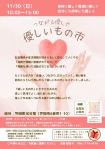 体と環境に配慮したブースによる「優しいもの市」が11月30日〔日〕午前10時―午後3時に笠岡市民会館(笠岡市6番町1―10)で開催される=写真。