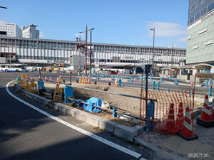市役所筋と桃太郎大通りが交差する岡山駅前の三叉路=写真=が、12月15日〔月〕から19日〔金〕までの5日間、午後10時から翌午前5時まで通行止めとなる。