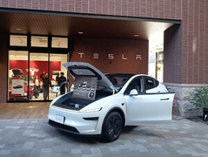 複合施設「杜の街グレース」(岡山市北区下石井2―10―8)1階に米国の電気自動車メーカー・テスラの直営店「テスラ岡山」=写真=がオープンした。