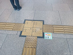 岡山市役所(岡山市北区大供1―1)1階のエレベーターホールに「コード化点字ブロック」と呼ばれる視覚障害者を音声で道案内する新システムが導入された=写真。