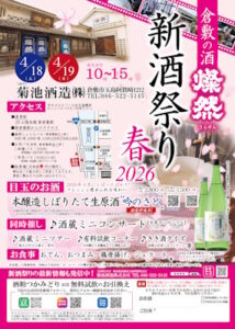 清酒メーカーの菊池酒造㈱(倉敷市玉島阿賀崎1212、菊池大輔社長、電086・522・5145)は、4月18日〔土〕、19日〔日〕の両日、しぼりたて生原酒の販売や酒蔵コンサートを盛り込んだ「新酒祭り春2026」=ポスター=を開催する。