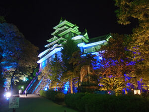 岡山後楽園と岡山城天守閣をライトアップして午後9時30分まで開場する「春の烏城灯源郷・幻想庭園」=写真=が5月5日〔火・祝〕まで開催されている。