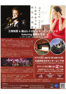 三塚知貴&福山レトロビート・ビッグバンド featuring藤野めぐみ~イマーシブホールコンサートday4~─が、4月13日〔日〕午後2時から、広島県民文化センターふくやま(福山市東桜町)で開催される。
