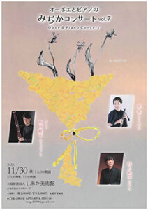 オーボエとピアノのみぢかコンサート11/30、しぶや美術館 2025年11月10日号 オーボエとピアノの みぢかコンサートvol.7 が、11月30日〔日〕午後2時から、しぶや美術館(福山市本町、電084・925・2113)で開催される。 オーボエ:沖恵、ピアノ:村上裕亮、ゲスト・ファゴット:角田修平。入場料は、一般2千円、学生1千円。未就学児無料。問い合わせは、電090・4894・1894へ。 « 前のページ 次のページ »